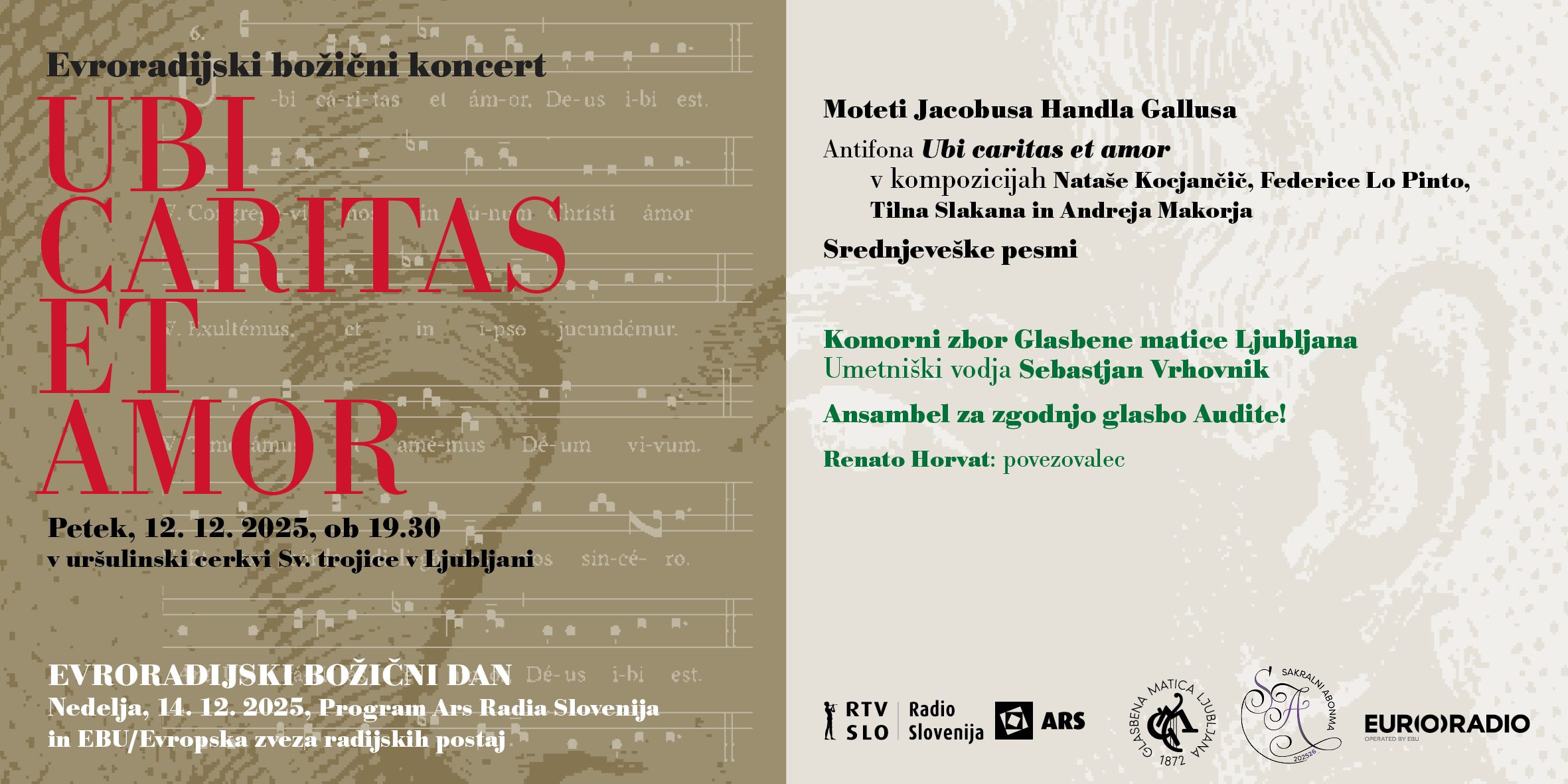 Komorni zbor glasbene matice Ljubljana pod vodstvom Sebastjana Vrhovnika bo program prepletel z uglasbitvami antifone Ubi caritas et amor slovenskih skladateljev Nataše Kocjančič, Andreja Makorja, Tilna Slakana in Federice Lo Pinto. Koncert bodo dopolnile pesmi iz srednjeveških zbirk v izvedbi ansambla za zgodnjo glasbo Audite!, ki ga umetniško vodi Janez Jocif.